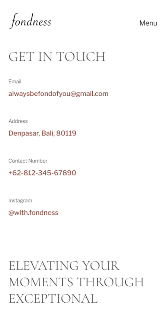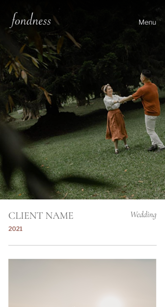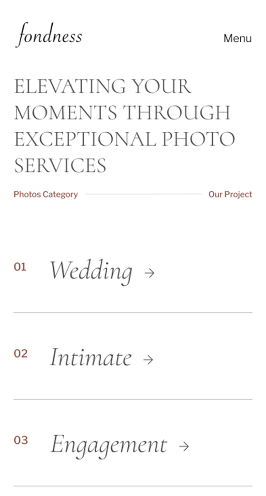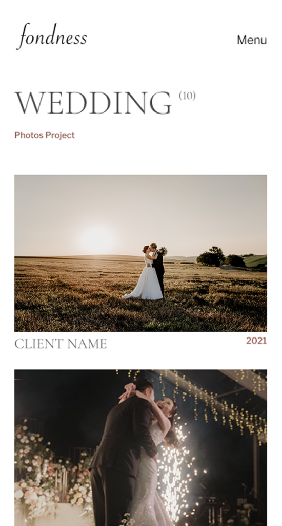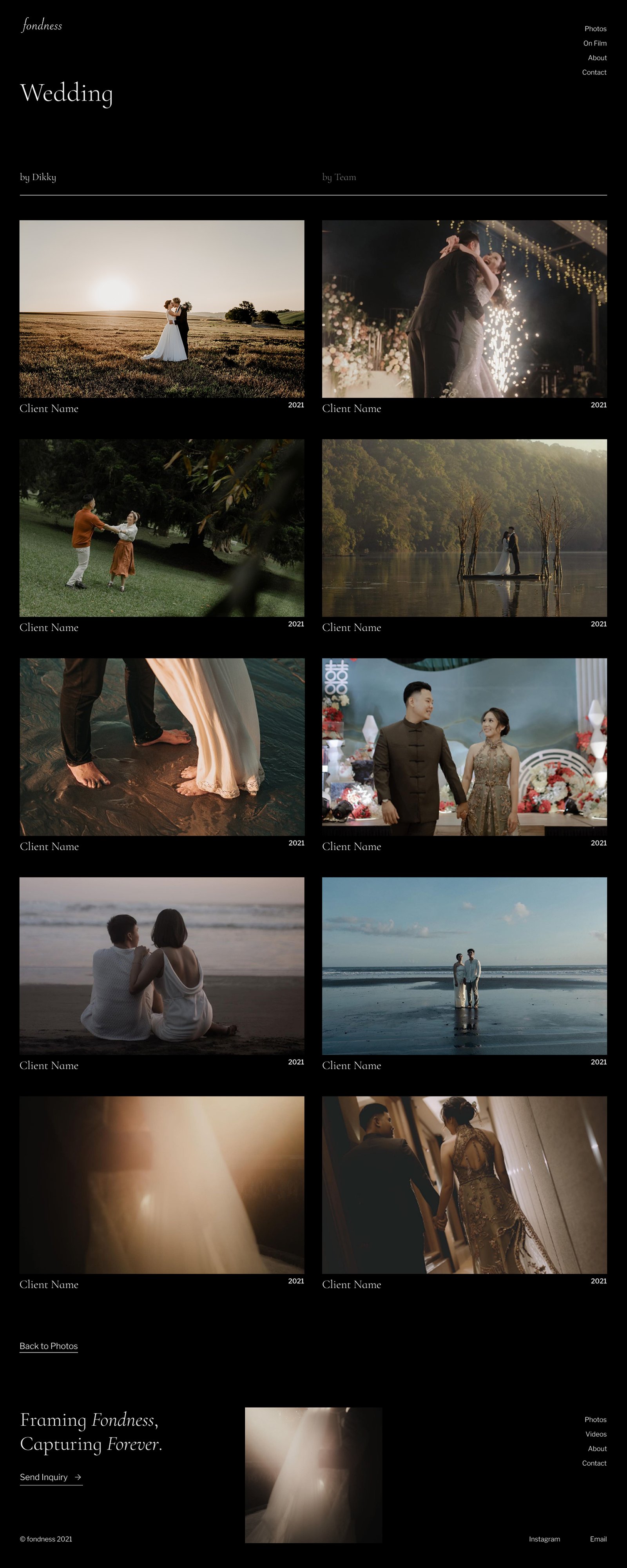 Atdawn created a website that reflects Fondness’s emotional yet modern identity. Through a soft and elegant design, the platform allows couples to explore past works while feeling connected to the studio’s mission of celebrating individuality in every story told.